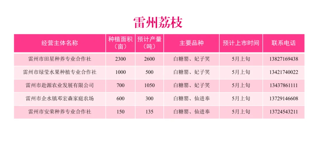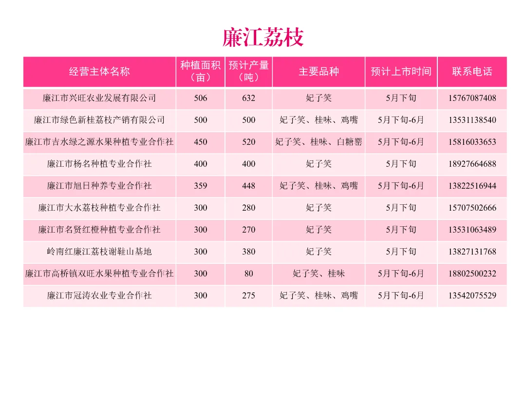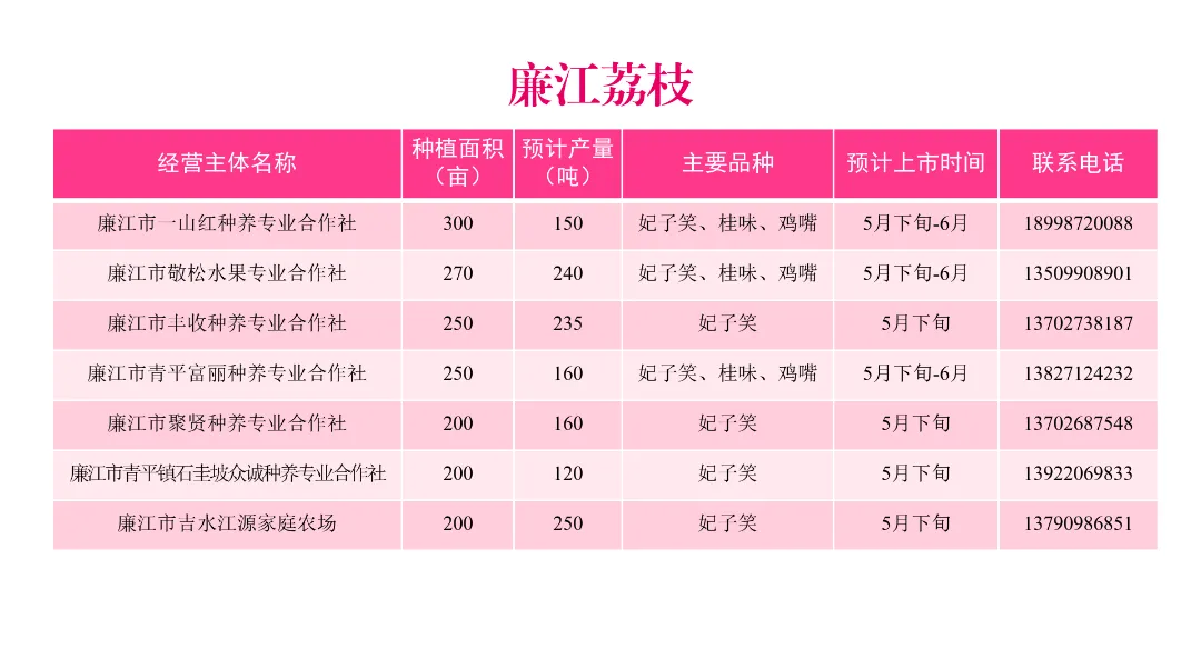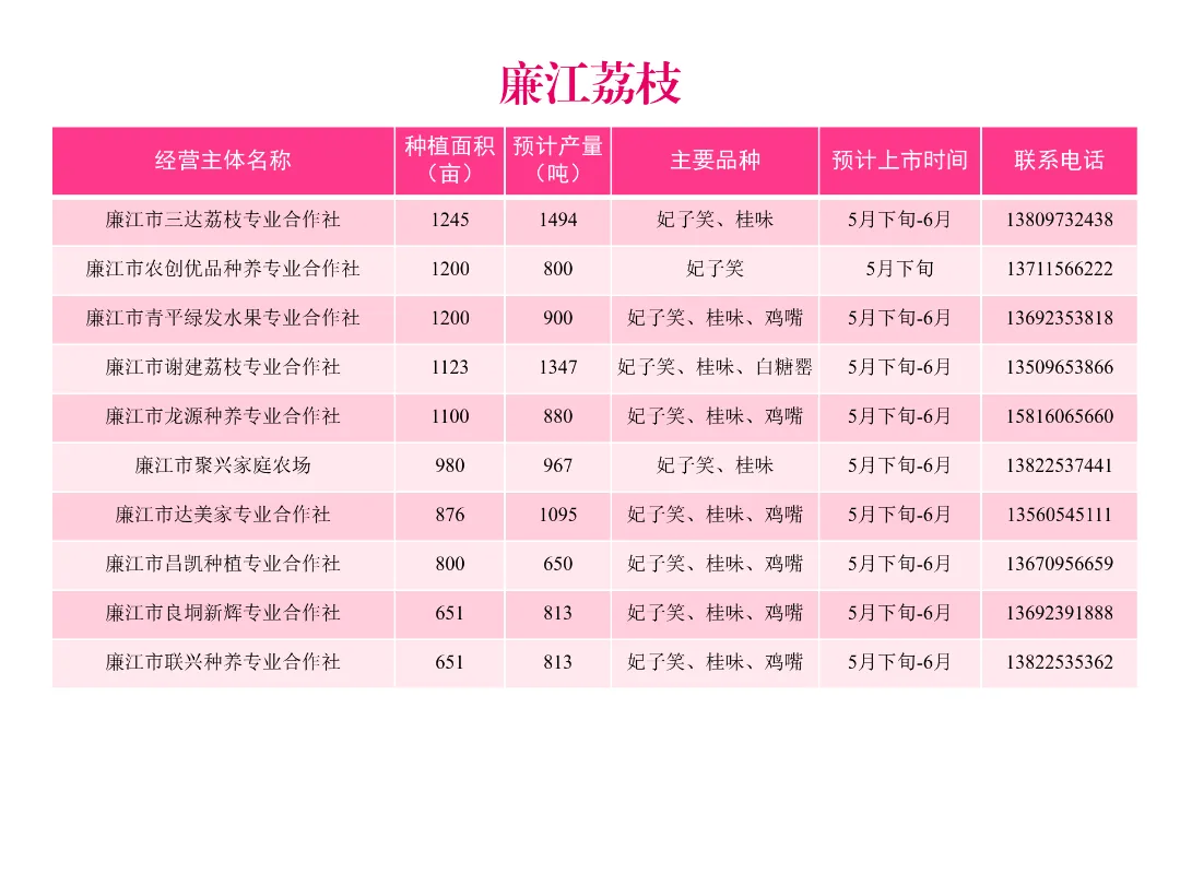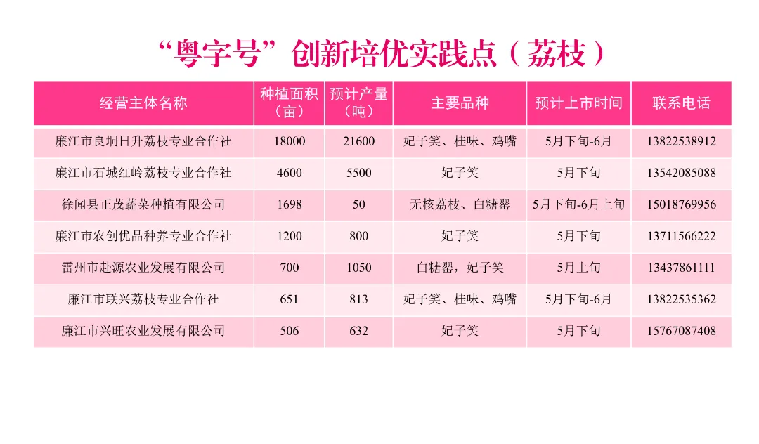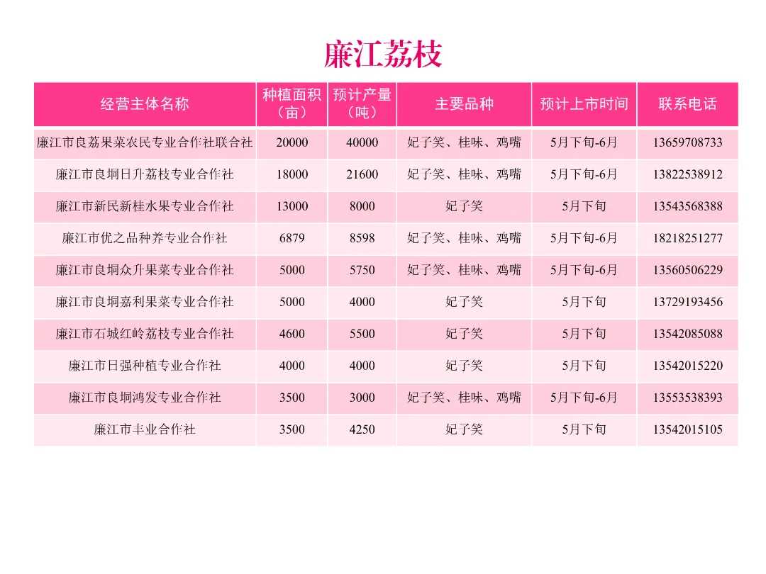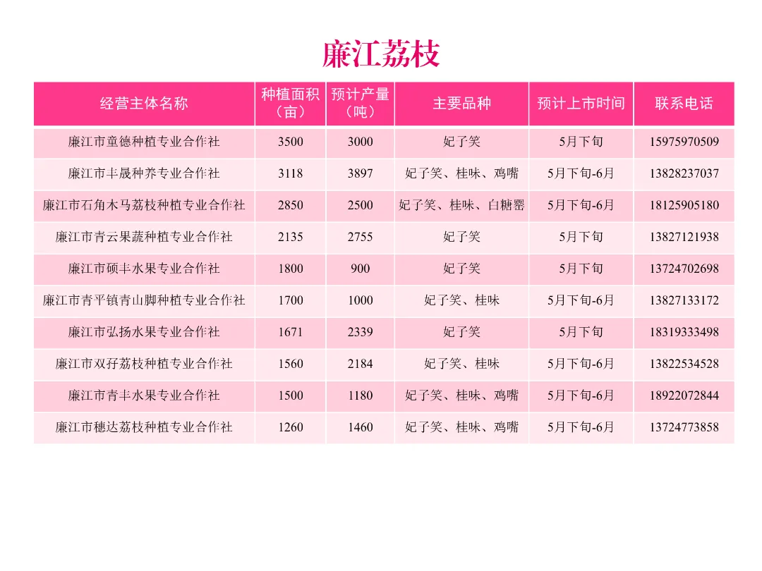 今年,我市荔枝种植面积约40万亩,预计产量26.9万吨,约占全省产量的16.8%,主要种植区为廉江市、雷州市、遂溪县、徐闻县等地。